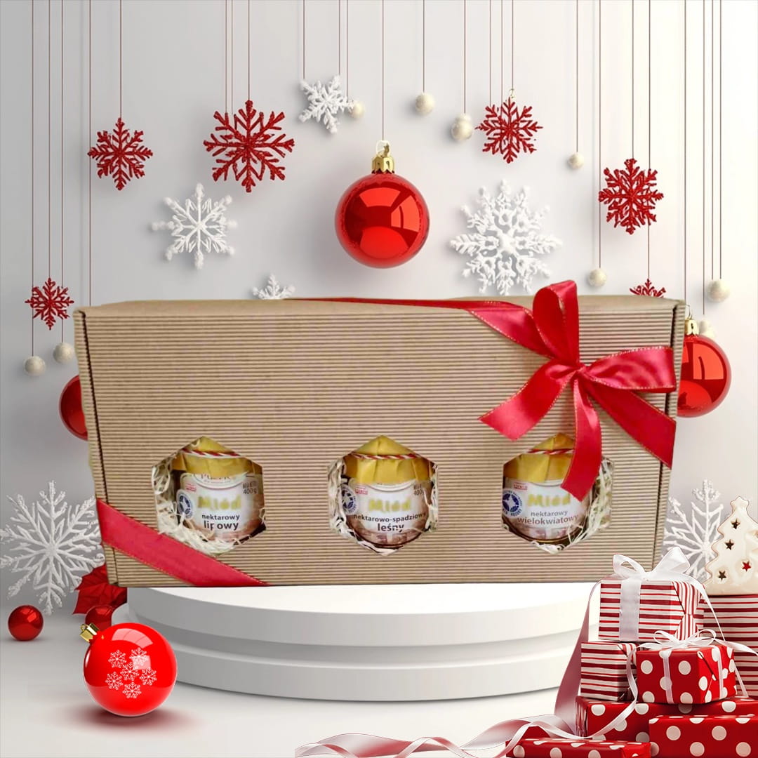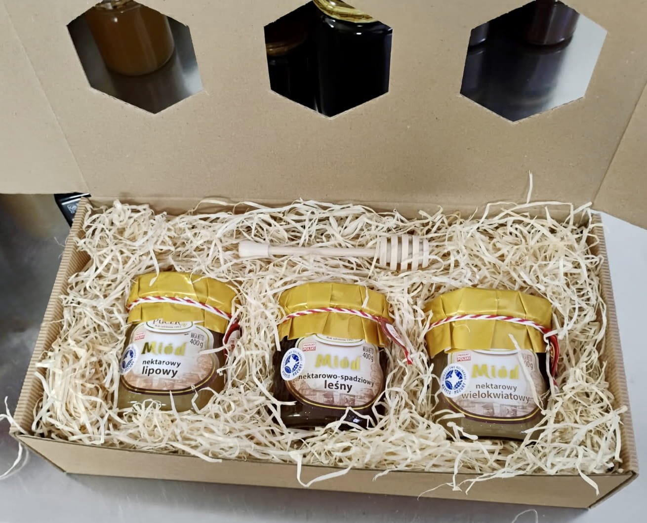 Zestaw wygląda dokładnie jak ten zaprezentowany na zdjęciach, w skład zestawu wchodzą : miód nektarowy lipowy , miód nektarowy wielokwiatowy, miód nektarowo-spadziowy leśny - każdy po 400 g. Zestaw przewiązany elegancką wstążką i pałeczką do miodu wewnątrz opakowania. Jest to duży zestaw o wymiarach pudełka 361 x 177 x 86 mm, karton ozdobny, falowany z wkładką wewnątrz.